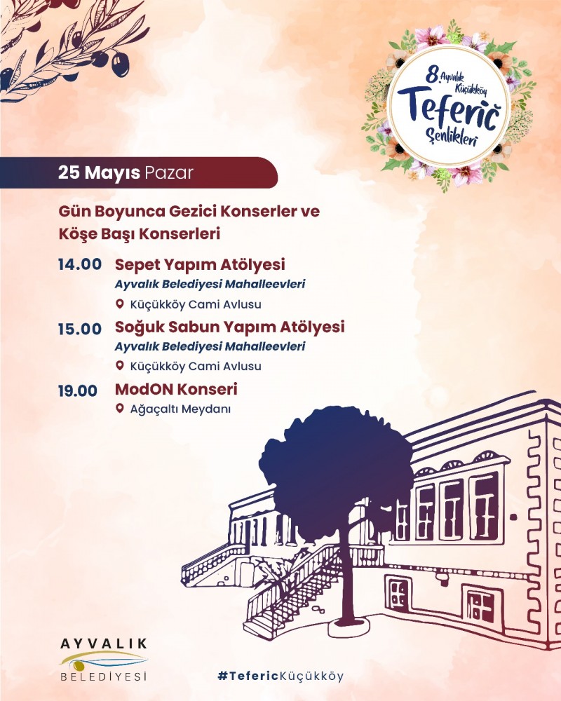 Şenliğin son günü 25 Mayıs Pazar günü, Ayvalık Belediyesi Mahalleevleri’nce, Küçükköy Cami Avlusundaki sepet yapımı atölyesine dileyenler katılabilecek, atölyenin başlama saati 14.00. Sepet yapımı atölyesinin ardından, soğuk sabun yapım atölyesinin sunumu yapılacak. 8. Ayvalık Küçükköy Teferic Şenlikleri Ağaçaltı Meydanı’nındaki Modon konseriyle sona erecek.