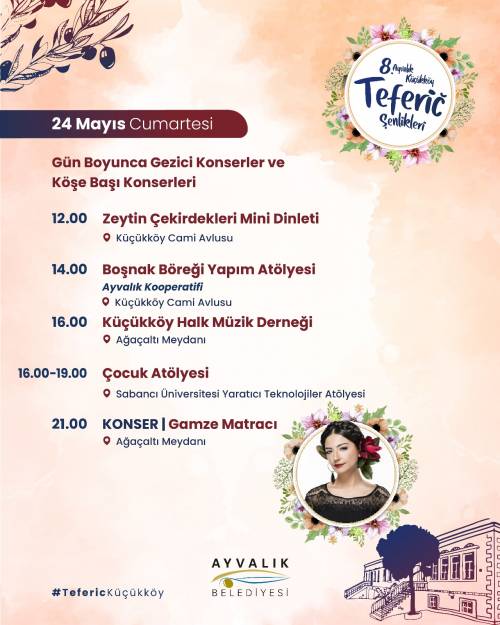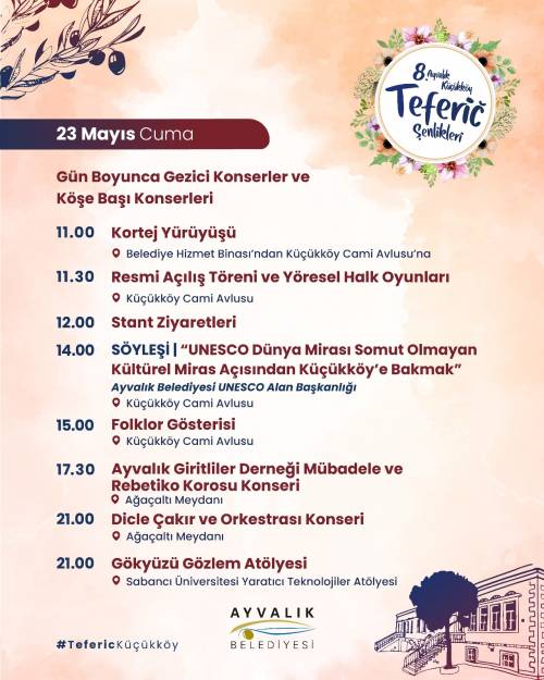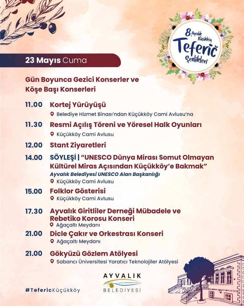 8. Ayvalık Küçükköy Teferic Şenlikleri’nin programı belli oldu. 23-24-25 Mayıs tarihleri arasında gerçekleştirilecek olan şenliğe bu yıl da katılımın çok yoğun olması bekleniyor. Gün boyunca gezici konserler ve köşebaşı konserleriye renklenecek olan şenlik, 23 Mayıs Cuma günü saat 11.00’de Küçükköy Belediye hizmet binasının önünden kortej yürüyüşüyle başlayacak.