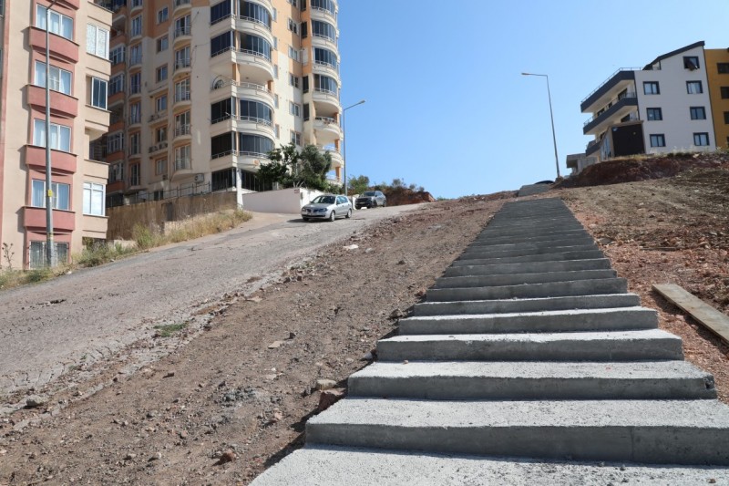 Atatürk Mahallesi’ndeki dik yokuşlar nedeniyle günlük işlerini görmek için uzun yürüyüşler yaparak ulaşım güçlüğü yaşayan vatandaşların yaşamını kolaylaştırmak için yokuşlara merdiven yapılıyor.