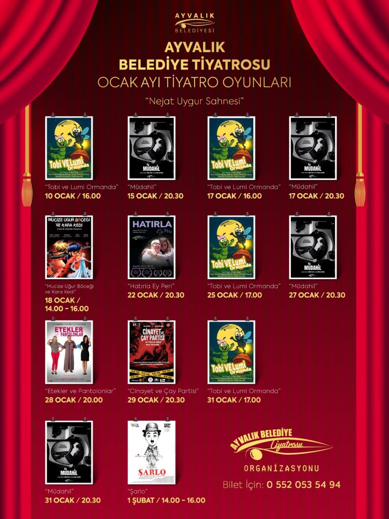 Öte yandan, Ayvalık Belediye Tiyatrosu’nun büyük ilgi gören ve onlarca kez sahnelenen Hatırla Ey Peri isimli oyunu, İnegöl, Balıkesir ve Ayvalık’ta “perde” diyecek. Ayvalık Belediye Tiyatrosu’nun organizasyonlarında ise, Ocak ayı içinde, Aliağa’dan Mucize Uğur Böceği ve Karakedi, İzmir'den "Şarlo" oyunu çocuklarla buluşacak. Dikili Umut Tiyatrosu’nun "Cinayet ve Çay Partisi" adlı komedi oyunu da Nejat Uygur Sahnesi'nde oynanacak. Ayrıca bu ay Nejat Uygur Sahnesi Nurseli İdiz'in oynadığı "Etekler ve Pantolonlar" oyununa da ev sahipliği yapacak.