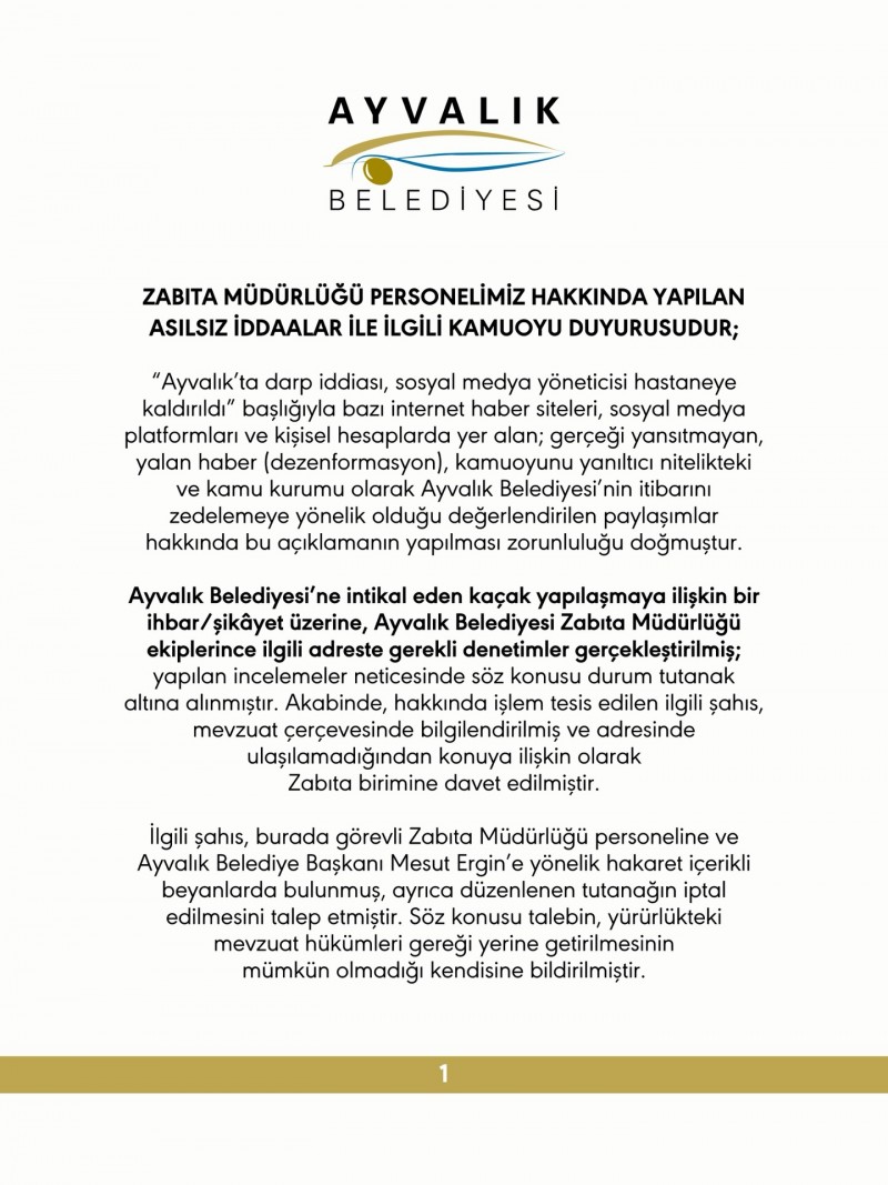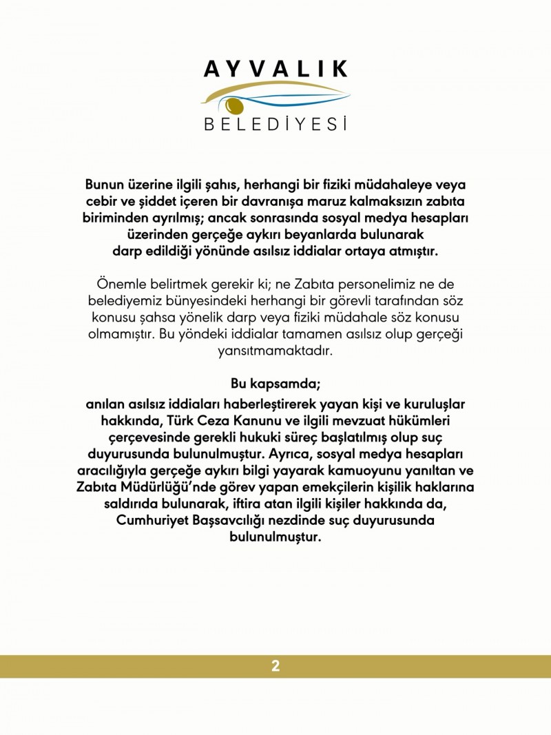 Ayvalık Belediyesi tarafından yapılan açıklamada, “Önemle belirtmek gerekir ki; ne zabıta personelimiz ne de belediyemiz bünyesindeki herhangi bir görevli tarafından söz konusu şahsa yönelik darp veya fiziki müdahale söz konusu olmamıştır. Bu yöndeki iddialar tamamen asılsız olup gerçeği yansıtmamaktadır. Bu kapsamda; anılan asılsız iddiaları haberleştirerek yayan kişi ve kuruluşlar hakkında, Türk Ceza Kanunu ve ilgili mevzuat hükümleri çerçevesinde gerekli hukuki süreç başlatılmış olup suç duyurusunda bulunulmuştur. Ayrıca, sosyal medya hesapları aracılığıyla gerçeğe aykırı bilgi yayarak kamuoyunu yanıltan ve Zabıta Müdürlüğü’nde görev yapan emekçilerin kişilik haklarına saldırıda bulunarak, iftira atan ilgili kişiler hakkında da, Cumhuriyet Başsavcılığı nezdinde suç duyurusunda bulunulmuştur.