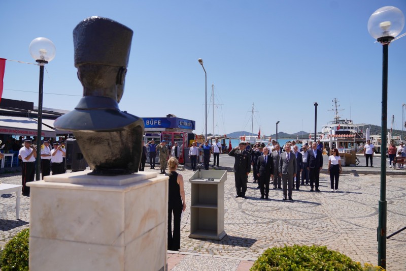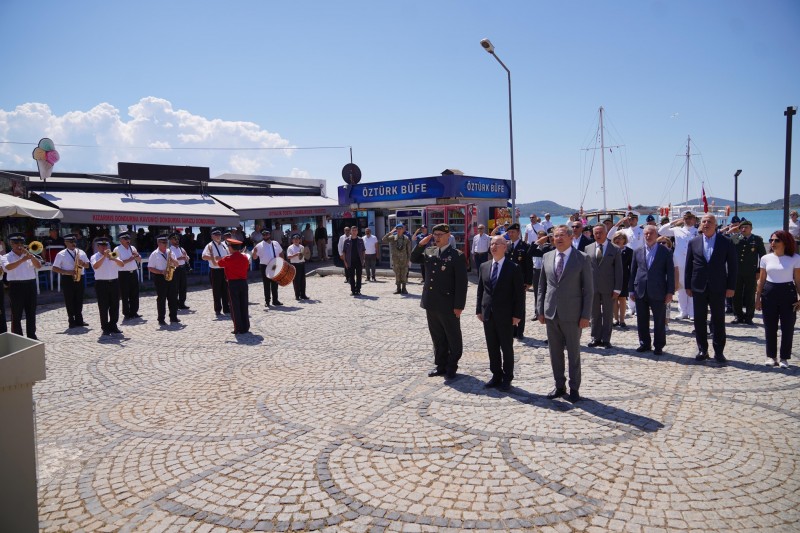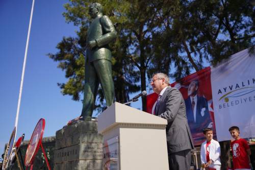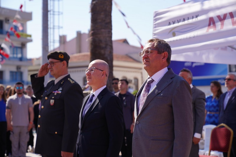 Cumhuriyet Meydanı'nda gerçekleştirilen saygı duruşu, istiklal marşı ve çelenk koyma törenine; Ayvalık Kaymakamı Hasan Yaman, Ayvalık Belediye Başkanı Mesut Ergin, Garnizon Komutanı Personel Albay Hüseyin Aydın, protokol üyeleri, sivil toplum örgütleri, siyasi parti temsilcileri ve çok sayıda vatandaş katıldı.