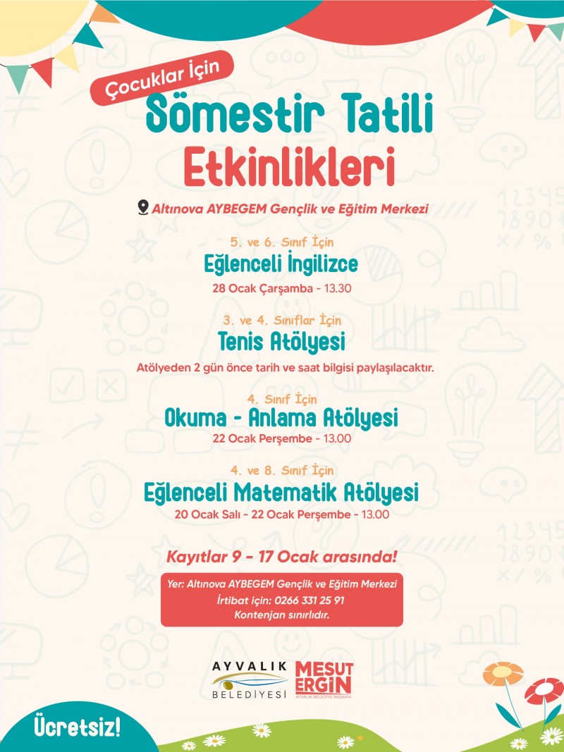 Ayvalık Belediyesi, sömestir tatilinde çocuklar için eğitici ve eğlenceli etkinliklerden oluşan zengin bir program hazırladı. Tatil boyunca düzenlenecek atölye ve kurslarla çocuklar hem keyifli vakit geçirecek hem de yeni beceriler kazanacak.