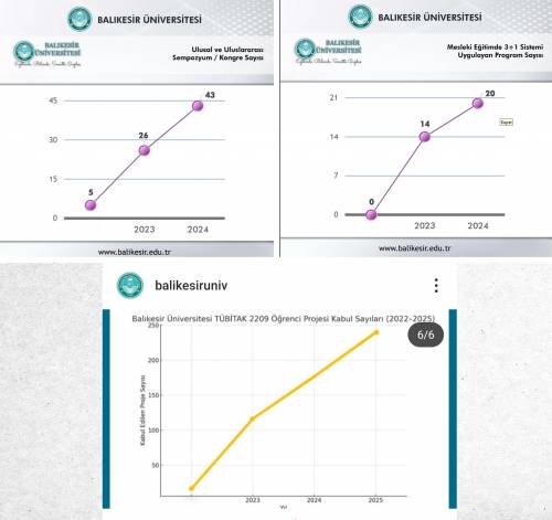 Tamamlanan dış destekli proje sayısı 2022’de yalnızca 3 iken, 2023’te 212’ye, 2024’te ise 233’e çıktı. Ulusal ve uluslararası sempozyum/kongre sayısı da üç yıl içinde 5’ten 43’e ulaşarak üniversitenin bilimsel görünürlüğünü artırdı.
