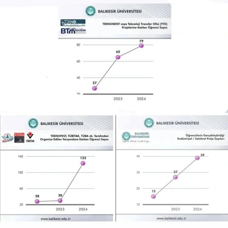 Üniversitenin Teknokent ya da Teknoloji Transfer Ofisi (TTO) bünyesindeki projelere katılan öğrenci sayısı 2022’de 27 iken, 2024 itibarıyla 79’a ulaştı. TEKNOFEST, TÜBİTAK ve TÜBA gibi kurumların düzenlediği yarışmalara katılan öğrenci sayısı ise 28’den 123’e çıkarak büyük bir sıçrama gösterdi.
