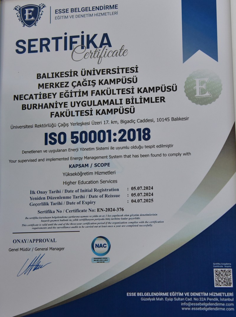 Balıkesir Üniversitesi Enerji Yönetimi Koordinatörlüğü tarafından yürütülen enerji verimliliği ve tasarruf çalışmaları kapsamında, enerji yönetim sisteminin üniversitede kurulması ve işletilmesi için gerekli hazırlıklar ve yapılan denetlemeler sonucu ISO 50001 belgesiyle sertifikalandırılan BAÜN’ün bu alandaki çalışmaları tescillenmiş oldu.