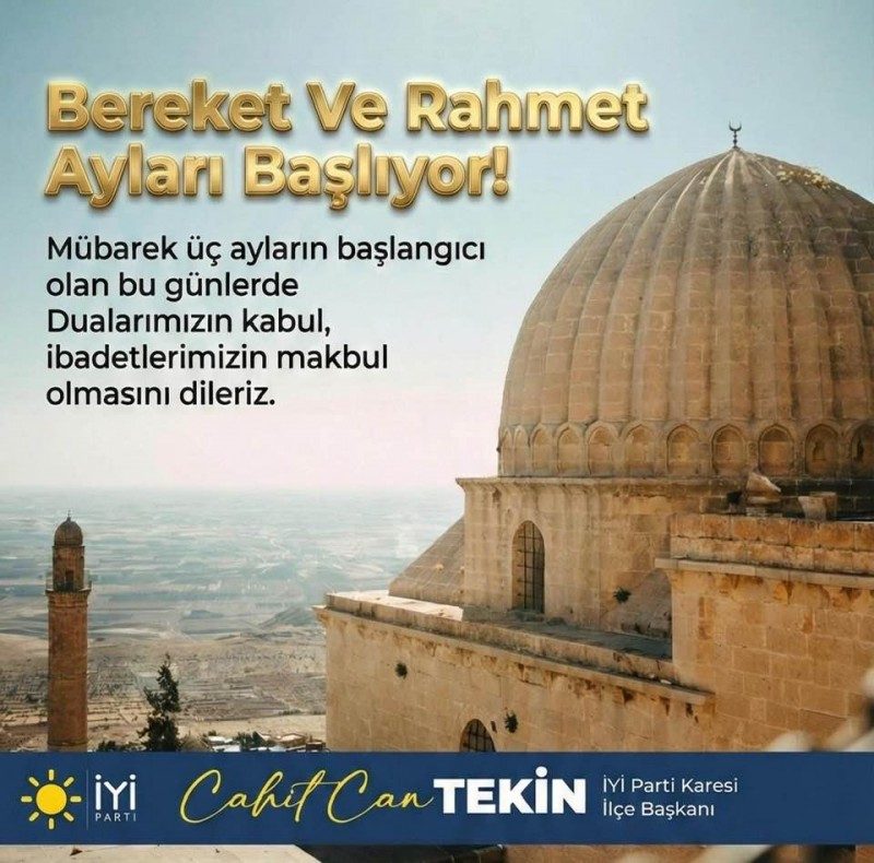 İYİ Parti Karesi İlçe Başkanı Cahit Can Tekin, mübarek üç ayların başlangıcı ve Regaip Kandili dolayısıyla yaptığı açıklamada, bu manevi zaman diliminin toplumsal duyarlılığı artıran güçlü bir hatırlatma niteliği taşıdığını ifade etti. Tekin, üç ayların; bireysel arınmanın ötesinde, ortak vicdanı ve toplumsal sorumluluğu yeniden düşünmeye davet ettiğini vurguladı.