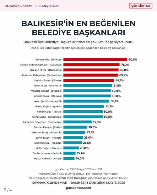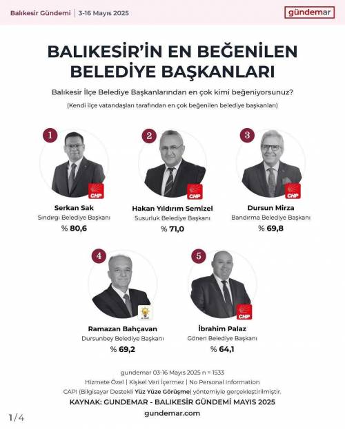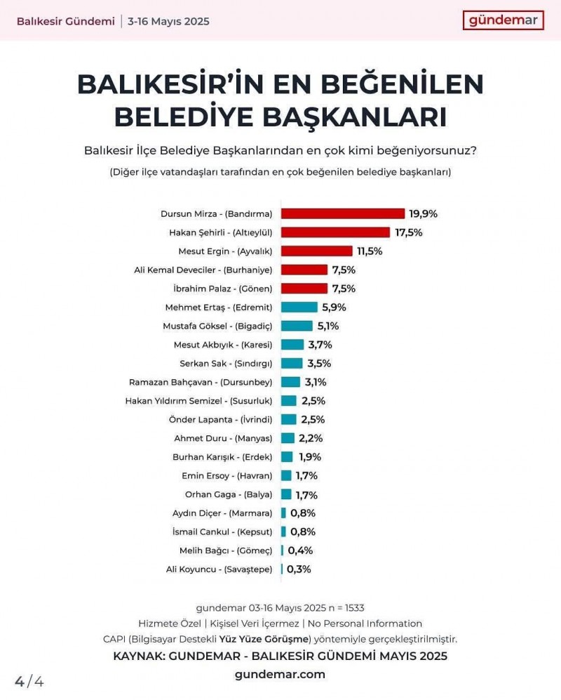 Ayrıca, Başkan Mirza kendi ilçesi Bandırma'da da yüzde 69,8 oranla en beğenilen 3. ilçe belediye başkanı oldu.