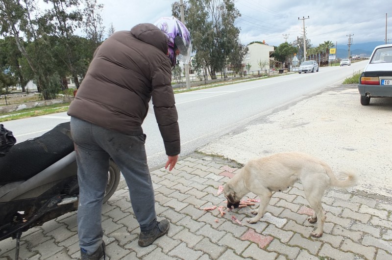 Edremit’in Akçay Mahallesinde oturan 44 yaşındaki Halil Türken, Edremit Körfezindeki sokak hayvanlarına sahip çıktı. Her gün motosikletine yüklediği yiyecekleri hayvanlara veren Türken, işini severek yaptığını söyledi. Kasaplardan ve marketlerden yiyecekler satın aldığını kaydeden Halil Türken, "Edremit Körfezinde nerede sokak köpeği varsa oraya gidiyorum. Hayvanlar berim motorun sesini duyunca geliyorlar. Şu anda da Burhaniye’nin Ali Çetinkaya Mahallesindeyim Buradaki köpeklere yiyecek verdim. Herkesin sokak hayvanlarına yardımcı olmasını istiyorum" dedi.