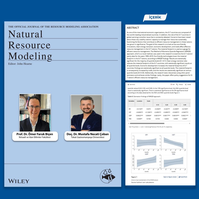 BAÜN akademisyenlerinden Prof. Dr. Ömer Faruk Biçen ve Tokat Gaziosmanpaşa Üniversitesi akademisyenlerinden Doç. Dr. Mustafa Necati Çoban tarafından yürütülen “The Path to Effective Resource Management: Exploring the Impact of Eco‐Friendly Innovations, Clean Energy Transition, Economic Development and Trade in G‐7 Countries” başlıklı çalışma, uluslararası dergi sıralamasının en üst dilimlerinde olan SCIE-Q2 ölçeğinde “Natural Resource Modeling” dergisinde yayımlandı.