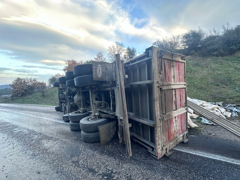 Edinilen bilgiye göre, Gönen-Denizkent yolu Ulukır mevkiinde sabah saatlerinde bir trafik kazası meydana geldi. Seyir halindeki 16 SR plakalı yem yüklü kamyon, sürücüsünün direksiyon hakimiyetini kaybetmesi sonucu devrildi. Kazada yaralanan olmazken, araçta maddi hasar oluştu.