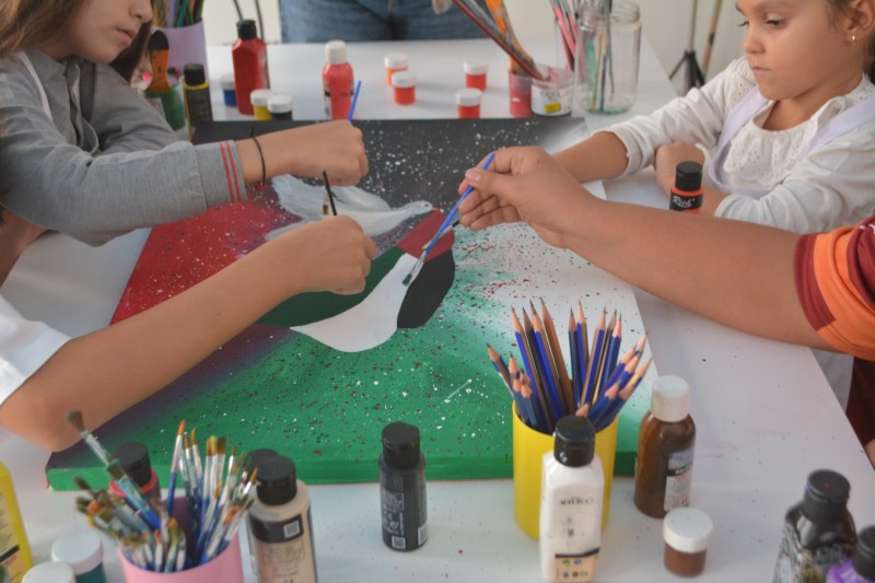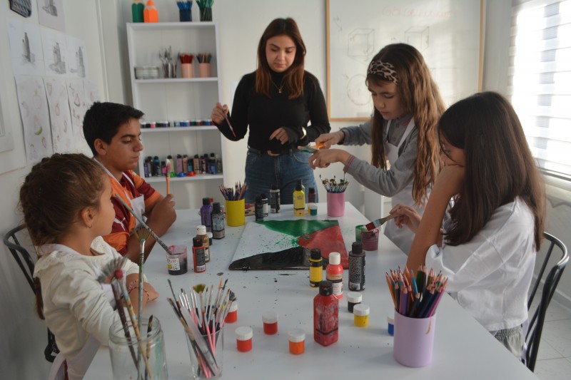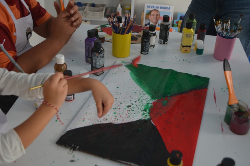 Atölyede resim yaptıklarını kaydeden Melek İşaret de, "Bugün burada çizdiğimiz resim, Gazze'de öldürülen çocuklarla ilgili, biz burada barışı, dayanışmayı ve dostluğu tuvalimize yansıtmaya çalıştık" ifadelerini kullandı.