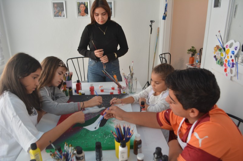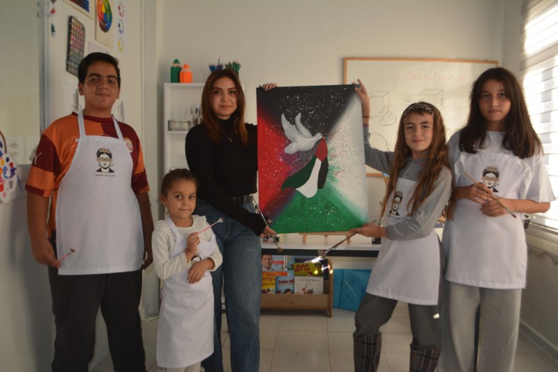 Resim yapmayı genç öğretmen Nursima Yıldız'dan öğrenmeye çalışan 7 yaşındaki Nisa Çandır, 9 yaşındaki Derin Dalay, 11 yaşındaki Melek İşaret ve 13 yaşındaki Emirhan Karayağız isimli dört dev yürekli, Gazze'de katledilen kendi yaşlarındaki çocukların katledilmemesi için bir barış güvercininin ağzındaki Filistin bayrağını resmederek, dünyaya adeta insanlık mesajı verdi.