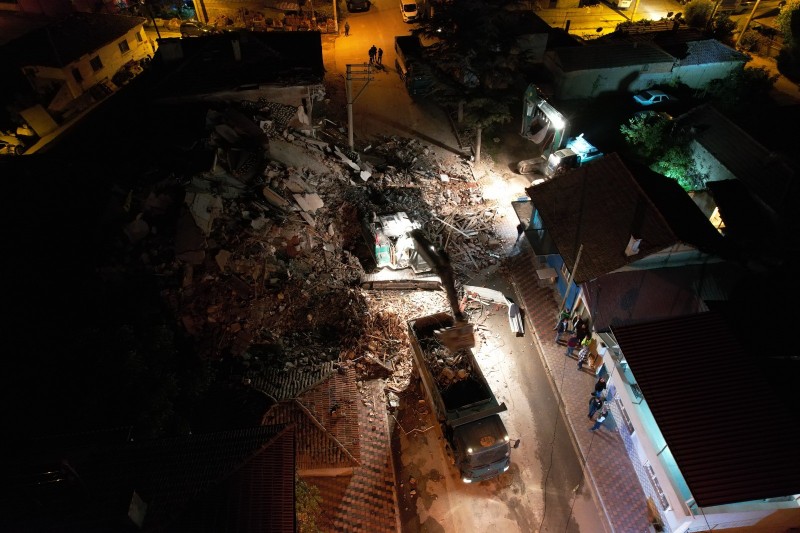 Balıkesir'in Sındırgı ilçesinde meydana gelen 6,1 büyüklüğündeki depremlerin ardından ağır hasarlı binalarda yıkım ve enkaz kaldırma çalışmaları sürüyor.