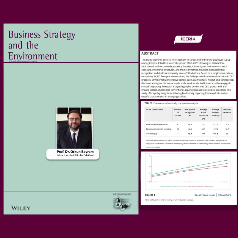BAÜN akademisyenlerinden Prof. Dr. Orkun Bayram, Doğuş Üniversitesi akademisyenlerinden Doç. Dr. Yavuz Selim Balcıoğlu ve Arş. Gör. Dr. Irmak Aksoy tarafından ortaya konulan “Sectoral Heterogeneity in Corporate Biodiversity Disclosure: Evidence from Chinese Listed Companies Across Industries, 2001–2023” başlıklı çalışma, uluslararası dergi sıralamasının en üst dilimlerinden olan SSCI-Q1 kategorisindeki Strategy and the Environment dergisinde yayımlandı.