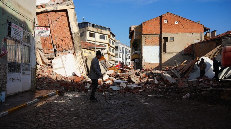 Sındırgı ilçesinde 27 Ekim'de meydana gelen depremin izleri silinmeye çalışılırken, kontrollü yıkım sırasında yaşanan bir olay yürekleri ağza getirdi. Hasarlı bir binanın yıkımı sırasında, hemen karşısında bulunan konteyner dükkân enkaz altında kaldı, iş makinesi oporatörün dikkatiyle kurtuldu.
