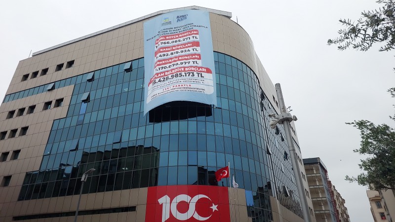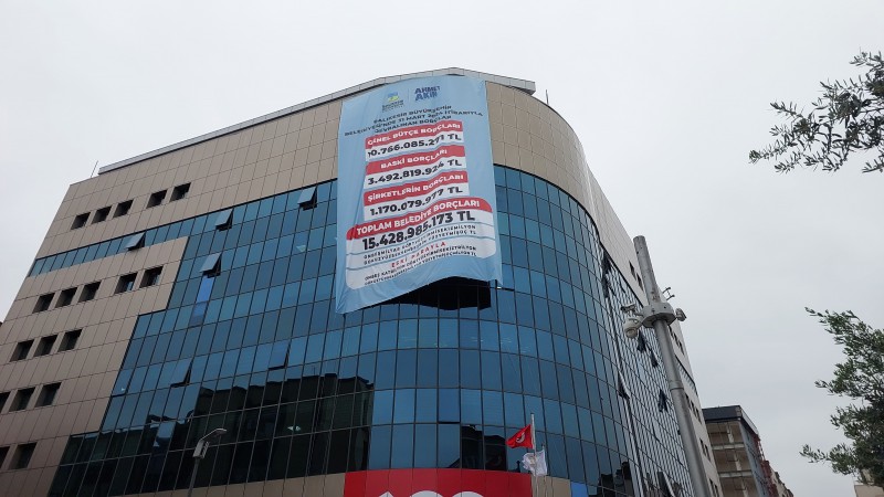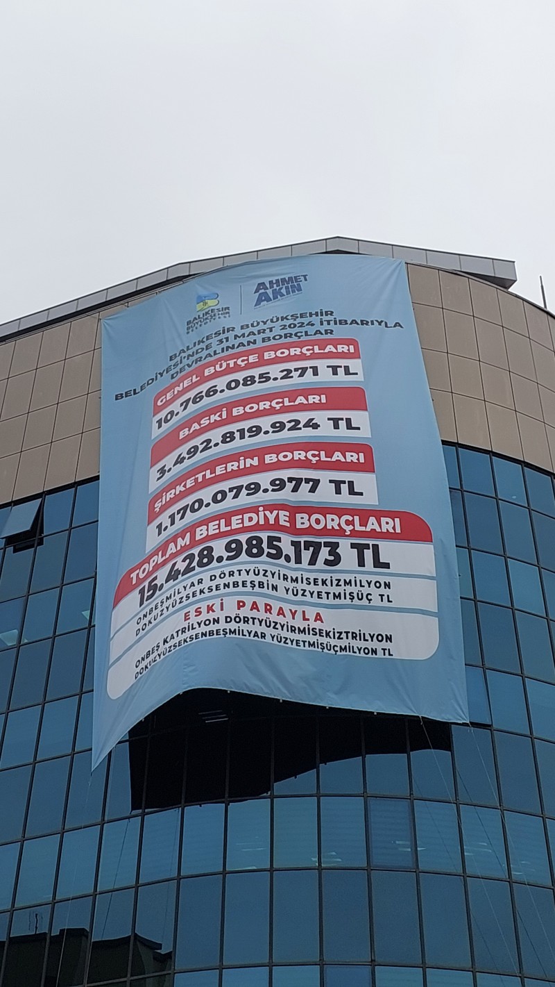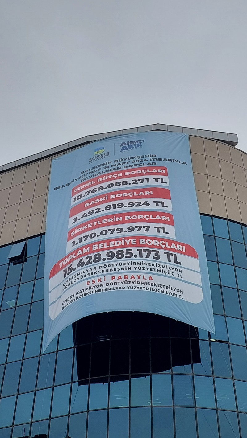 Balıkesir Büyükşehir Belediye Başkanı Ahmet Akın, AK Partili Başkan Yücel Yılmaz’dan kalan borçları Büyükşehir Belediye Binasına astı. Açıklanan tabloya göre borç 15 milyar 428 milyon 985 bin TL.