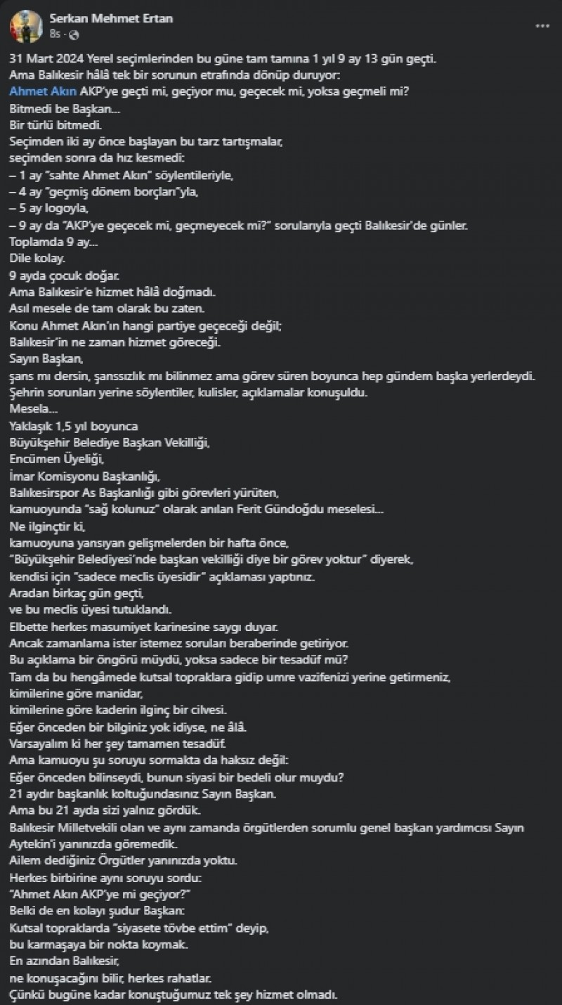 “31 Mart 2024 Yerel seçimlerinden bugüne tam tamına 1 yıl 9 ay 13 gün geçti. Ama Balıkesir hâlâ tek bir sorunun etrafında dönüp duruyor: Ahmet Akın AKP’ye geçti mi, geçiyor mu, geçecek mi, yoksa geçmeli mi? Bitmedi be Başkan… Bir türlü bitmedi. Seçimden iki ay önce başlayan bu tarz tartışmalar, seçimden sonra da hız kesmedi: – 1 ay “sahte Ahmet Akın” söylentileriyle, – 4 ay “geçmiş dönem borçları”yla, – 5 ay logoyla, – 9 ay da “AKP’ye geçecek mi, geçmeyecek mi?” sorularıyla geçti Balıkesir'de günler. Toplamda 9 ay… Dile kolay. 9 ayda çocuk doğar. Ama Balıkesir’e hizmet hâlâ doğmadı. Asıl mesele de tam olarak bu zaten. Konu Ahmet Akın’ın hangi partiye geçeceği değil; Balıkesir’in ne zaman hizmet göreceği. Sayın Başkan, şans mı dersin, şanssızlık mı bilinmez ama görev süren boyunca hep gündem başka yerlerdeydi. Şehrin sorunları yerine söylentiler, kulisler, açıklamalar konuşuldu. Mesela… Yaklaşık 1,5 yıl boyunca Büyükşehir Belediye Başkan Vekilliği, Encümen Üyeliği, İmar Komisyonu Başkanlığı, Balıkesirspor As Başkanlığı gibi görevleri yürüten, kamuoyunda “sağ kolunuz” olarak anılan Ferit Gündoğdu meselesi… Ne ilginçtir ki, kamuoyuna yansıyan gelişmelerden bir hafta önce, “Büyükşehir Belediyesi’nde başkan vekilliği diye bir görev yoktur” diyerek, kendisi için “sadece meclis üyesidir” açıklaması yaptınız. Aradan birkaç gün geçti, ve bu meclis üyesi tutuklandı. Elbette herkes masumiyet karinesine saygı duyar. Ancak zamanlama ister istemez soruları beraberinde getiriyor. Bu açıklama bir öngörü müydü, yoksa sadece bir tesadüf mü? Tam da bu hengâmede kutsal topraklara gidip umre vazifenizi yerine getirmeniz, kimilerine göre manidar, kimilerine göre kaderin ilginç bir cilvesi. Eğer önceden bir bilginiz yok idiyse, ne âlâ. Varsayalım ki her şey tamamen tesadüf. Ama kamuoyu şu soruyu sormakta da haksız değil: Eğer önceden bilinseydi, bunun siyasi bir bedeli olur muydu? 21 aydır başkanlık koltuğundasınız Sayın Başkan. Ama bu 21 ayda sizi yalnız gördük. Balıkesir Milletvekili olan ve aynı zamanda örgütlerden sorumlu genel başkan yardımcısı Sayın Aytekin'i yanınızda göremedik. Ailem dediğiniz Örgütler yanınızda yoktu. Herkes birbirine aynı soruyu sordu: “Ahmet Akın AKP’ye mi geçiyor?” Belki de en kolayı şudur Başkan: Kutsal topraklarda “siyasete tövbe ettim” deyip, bu karmaşaya bir nokta koymak. En azından Balıkesir, ne konuşacağını bilir, herkes rahatlar. Çünkü bugüne kadar konuştuğumuz tek şey hizmet olmadı.”