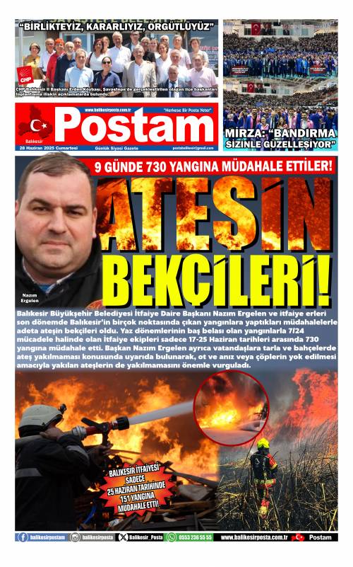 Balıkesir Büyükşehir Belediyesi İtfaiye Daire Başkanı Nazım Ergelen ve itfaiye erleri son dönemde Balıkesir’in birçok noktasında çıkan yangınlara yaptıkları müdahalelerle adeta ateşin bekçileri oldu. Yaz dönemlerinin baş belası olan yangınlarla 7/24 mücadele halinde olan İtfaiye ekipleri sadece 17-25 Haziran tarihleri arasında 730 yangına müdahale etti. Başkan Nazım Ergelen ayrıca vatandaşlara tarla ve bahçelerde ateş yakılmaması konusunda uyarıda bulunarak, ot ve anız veya çöplerin yok edilmesi amacıyla yakılan ateşlerin de yakılmamasını önemle vurguladı.