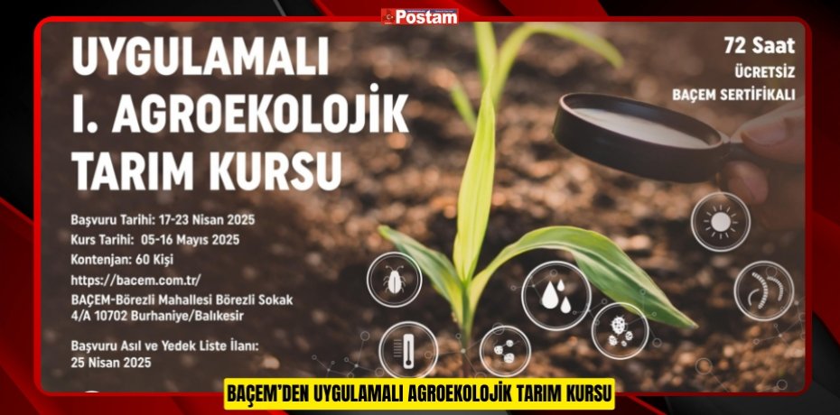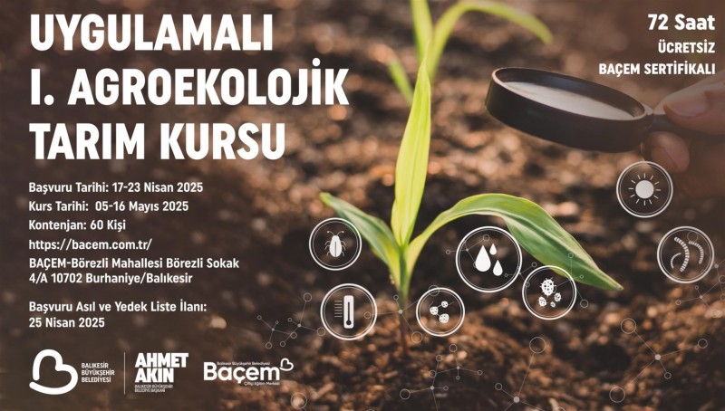 Sürdürülebilir, doğayla uyumlu tarımsal üretimi desteklemek ve bu konuyu yaygınlaştırıp öncülük etmek üzere BAÇEM tarafından açılacak “Uygulamalı 1. Agroekolojik Tarım Kursu” için başvurular 17-23 Nisan 2025 tarihlerinde alınacak. 5-16 Mayıs tarihleri arasında düzenlenecek kurs için başvurular https://bacem.com.tr/ ve https://balikesir.bel.tr/ internet adresinden alınacak. Başvuru asıl ve yedek liste ilanını 25 Nisan’da yapacak olan BAÇEM’in 60 kişilik “Uygulamalı 1. Agroekolojik Tarım Kursu” sonunda katılımcılara sertifikaları takdim edilecek.