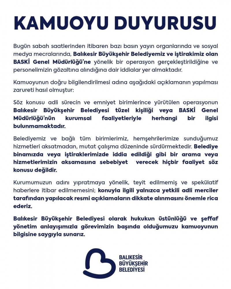 Operasyon ardından Balıkesir Büyükşehir Belediyesi'nden yazılı açıklama yapıldı. Açıklamada, "Bazı basın yayın organlarında ve sosyal medya mecralarında, Balıkesir Büyükşehir Belediyemiz ve iştirakimiz olan BASKİ Genel Müdürlüğü'ne yönelik bir operasyon gerçekleştirildiğine ve personelimizin gözaltına alındığına dair iddialar yer almaktadır. Söz konusu adli sürecin ve emniyet birimlerince yürütülen operasyonun Balıkesir Büyükşehir Belediyesi tüzel kişiliği veya BASKİ Genel Müdürlüğü'nün kurumsal faaliyetleriyle herhangi bir ilgisi bulunmamaktadır. Belediyemiz ve bağlı tüm birimlerimiz, hemşehrilerimize sunduğumuz hizmetleri aksatmadan, mutat çalışma düzeninde sürdürmektedir. Belediye binamızda veya iştiraklerimizde iddia edildiği gibi bir arama veya hizmetlerimizin aksamasına sebebiyet verecek hiçbir faaliyet söz konusu değildir. Kurumumuzun adını yıpratmaya yönelik, teyit edilmemiş ve spekülatif haberlere itibar edilmemesini; konuyla ilgili yalnızca yetkili adli merciler tarafından yapılacak resmi açıklamaların dikkate alınmasını önemle rica ederiz. Balıkesir Büyükşehir Belediyesi olarak hukukun üstünlüğü ve şeffaf yönetim anlayışımızla görevimizin başında olduğumuzu kamuoyunun bilgisine saygıyla sunarız" denildi.