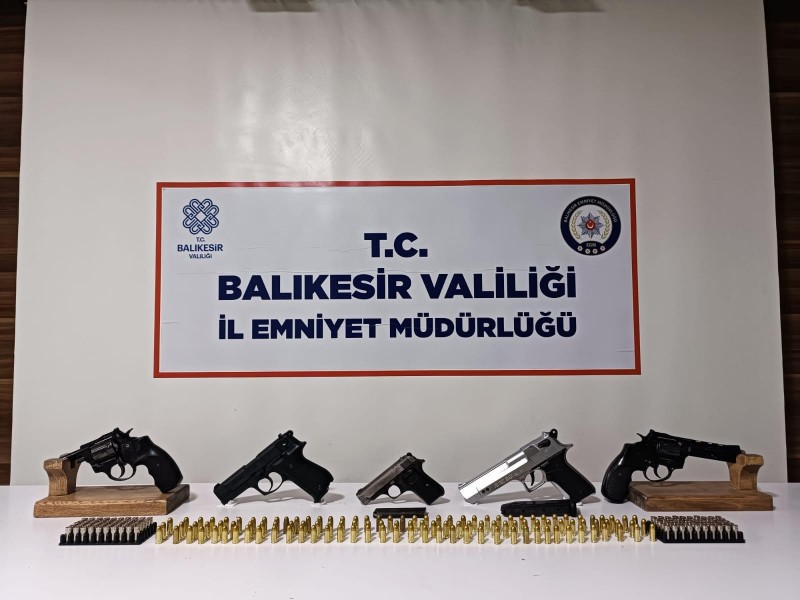 Edinilen bilgiye göre, Bandırma İlçe Emniyet Müdürlüğü Asayiş Büro Amirliği ekipleri, U.A. (42) isimli şahsın ikametinde arama yaptı. Aramada 4 ruhsatsız tabanca, 1 havalı tabanca, 117 adet tabanca fişeği ve 100 adet kuru sıkı fişek bulundu.