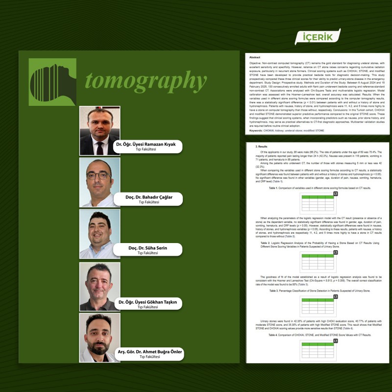 BAÜN akademisyenlerinden Dr. Öğr. Üyesi Ramazan Kıyak, Dr. Öğr. Üyesi Meliha Fındık, Doç. Dr. Bahadır Çağlar, Doç. Dr. Süha Serin, Dr. Öğr. Üyesi Gökhan Taşkın ve Arş. Gör. Dr. Ahmet Buğra Önler tarafından ortaya koyulan “Can Clinical Scores Reduce CT Use in Renal Colic? A Head-to-Head Comparison” başlıklı çalışma, uluslararası dergi sıralamalarında en üst dilim olan Q2 ölçeğindeki “Tomography” dergisinde yayımlandı.