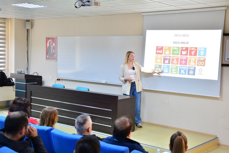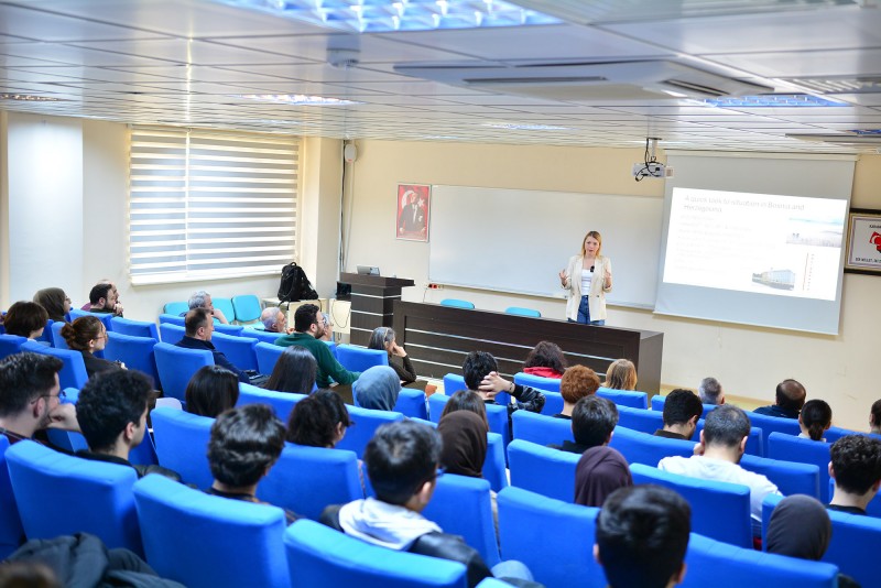 Akademik ve idari personel ile öğrencilerin izlediği seminerde, üniversitelerde sürdürülebilirlik odaklı uygulamaların önemi ele alınırken; çevresel, ekonomik ve sosyal boyutlarıyla sürdürülebilir kampüs anlayışına yönelik iyi uygulama örnekleri katılımcılarla paylaşıldı. Doç. Dr. Özge Büyükdağlı, yükseköğretim kurumlarının sürdürülebilir kalkınma hedefleri doğrultusunda üstlendiği rolü vurgulayarak, bu alanda geliştirilen yenilikçi yaklaşımlar ve Uluslararası Saraybosna Üniversitesinde yürütülen çalışmalar hakkında bilgi verdi.