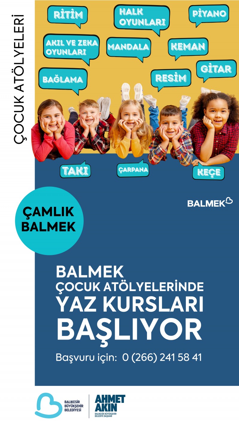 Balıkesir Büyükşehir Belediyesi Kültür Sosyal İşler Dairesi Başkanlığı Yaygın Eğitim Şube Müdürlüğü (BALMEK) koordinesinde başlatılan atölyelerde 8-18 yaş arasındaki öğrenciler 8 haftalık bir eğitim sürecinden geçecek. 7 Temmuz- 29 Ağustos tarihleri arasında gerçekleşecek kurslara 0266 241 58 41 iletişim numarasından kayıt oluşturulabilecek. Son başvuru tarihi olmayan atölyelerde kontenjan doluluğuna göre eğitime başlanacak. Başvuruları alınmaya başlayan BALMEK çocuk atölyelerindeki yaz kurslarında; ritim, halk oyunları, resim, piyano, gitar, bağlama, keman, mandala, akıl ve zekâ oyunları, çarpana, keçe, takı gibi 11 atölyede çocuklar eğlenirken öğrenecek. İl merkezinde 11 atölye için 8-12 yaş ve 13-18 yaş arası çocuklar için iki grup halinde, akıl ve zekâ oyunları atölyesinde ise 6-8 yaş grubu çocuklar için iki grup halinde 8 hafta boyunca eğitim verilecek.
