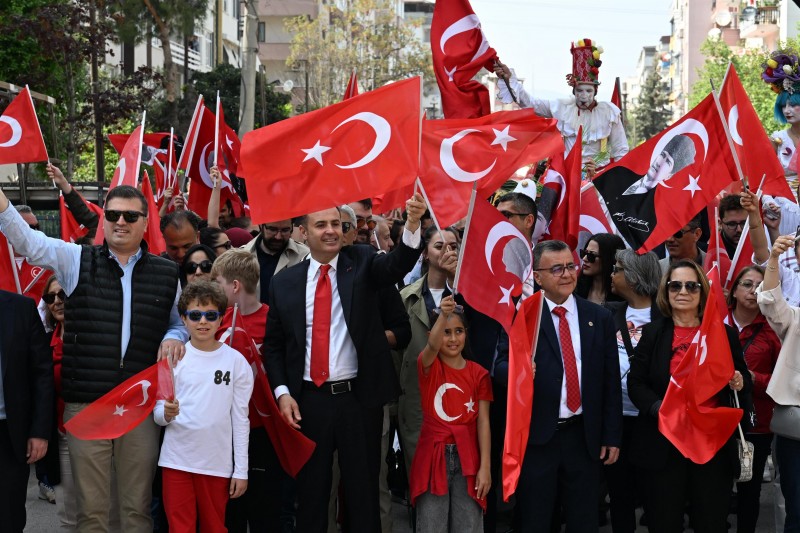Akın, Karesi Belediyesinin Atatürk İlkokulu’nda düzenlediği kutlama programında çocukların coşkusuna eşlik ederken programa katılan miniklerin bayramını kutladı. Çocukların neşesini birlikte yaşayan Akın, Altıeylül Belediyesi tarafından organize edilen kortej yürüyüşüne katıldı. Renkli ve duygu dolu anların yaşandığı yürüyüşte Akın ve Altıeylül Belediye Başkanı Hakan Şehirli, kortej boyunca elinde Türk bayrağıyla sokakları dolduran çocukların bayramını kutladı. Kuvayımilliye Meydanından başlayan yürüyüş Asuva Parkı’ta sona erdi. Başkan Akın, kortej boyunca çocuklarla el ele yürüdü. Balıkesirli vatandaşlar, balkonlarından ıslık ve alkışlarla yürüyüşe destek verirken ön sıralarda yer alan çizgi film karakterlerinin maskotları korteje renk kattı. 7’den 70’e herkesin katıldığı yürüyüşte vatandaşlar, ellerinde Türk Bayraklarıyla marşlar söyledi.