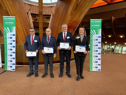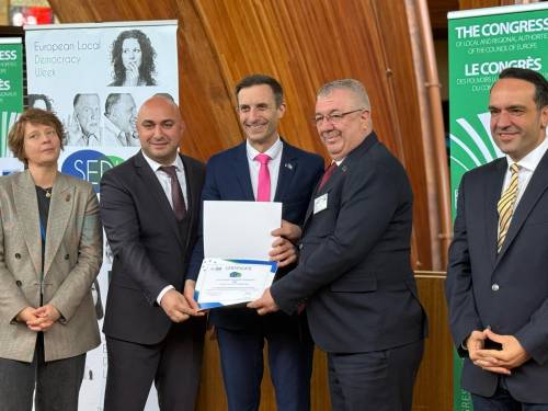 Fransa’nın Strasbourg kentinde düzenlenen Avrupa Yerel Demokrasi Haftası Koordinasyon Toplantısı kapsamında verilen ödülü, Edremit Belediye Başkanı Mehmet Ertaş, Avrupa Konseyi Yerel ve Bölgesel Yönetimler Kongresi Genel Sekreteri Mathieu Mori’nin elinden aldı. Başkan Ertaş’a, İnsan Kaynakları ve Eğitim Müdürü Tamer Acar eşlik etti.
