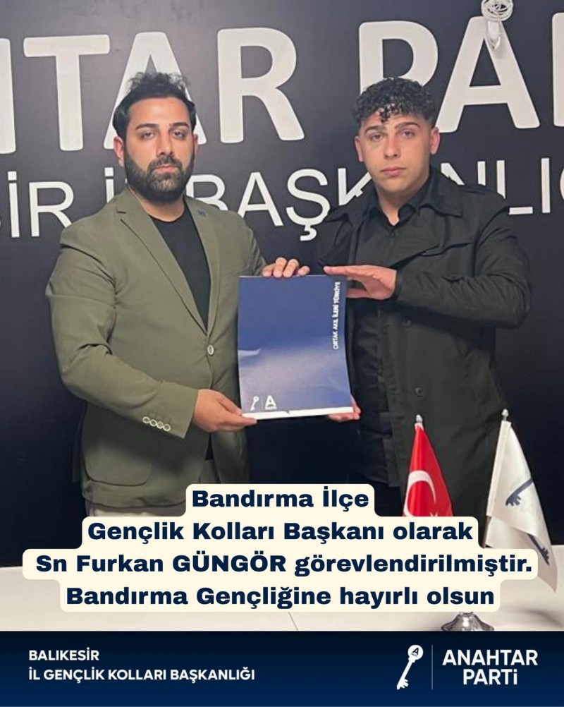 Anahtar Parti Balıkesir Gençlik Kolları Başkanı Çağrı Ünal tarafından gençlik yapılanmasına yönelik yeni görevlendirmeler gerçekleştirildi.Bu kapsamda Furkan Güngör, Bandırma İlçe Gençlik Kolları Başkanlığı görevine getirilirken, Mervenur Midilli ise Balıkesir İl Gençlik Kolları Üniversiteler Başkanlığı görevine atandı.
