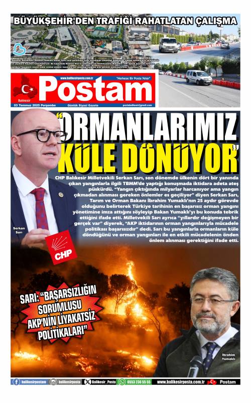 CHP Balıkesir Milletvekili Serkan Sarı, son dönemde ülkenin dört bir yanında çıkan yangınlarla ilgili TBMM’de yaptığı konuşmada iktidara adeta ateş püskürdü. “Yangın çıktığında milyarlar harcanıyor ama yangın çıkmadan alınması gereken önlemler es geçiliyor” diyen Serkan Sarı, Tarım ve Orman Bakanı İbrahim Yumaklı’nın 25 aydır görevde olduğunu belirterek Türkiye tarihinin en başarısız orman yangını yönetimine imza attığını söyleyip Bakan Yumaklı’yı bu konuda tebrik ettiğini ifade etti. Milletvekili Sarı ayrıca “yıllardır değişmeyen bir gerçek var” diyerek, “AKP iktidarının orman yangınlarıyla mücadele politikası başarısızdır” dedi. Sarı bu yangınlarla ormanların küle döndüğünü ve orman yangınları ile en etkili mücadelenin önden önlem alınması gerektiğini ifade etti.