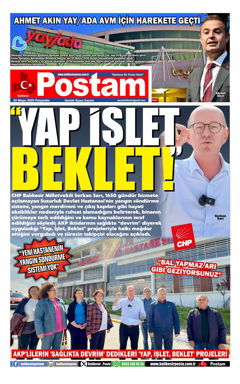 CHP Balıkesir Milletvekili Serkan Sarı, 1650 gündür hizmete açılamayan Susurluk Devlet Hastanesi'nin yangın söndürme sistemi, yangın merdiveni ve çıkış kapıları gibi hayati eksiklikler nedeniyle ruhsat alamadığını belirterek, binanın çürümeye terk edildiğini ve kamu kaynaklarının israf edildiğini söyledi; AKP iktidarının sağlıkta “devrim” diyerek uyguladığı “Yap, İşlet, Beklet” projeleriyle halkı mağdur ettiğini vurguladı ve sürecin takipçisi olacağını açıkladı.