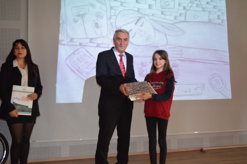 İl Sağlık Müdürü Uzm. Dr. Serkan Kadir Keskin, yarışmada ikinci olan Balıkesir İmam Hatip Ortaokulu öğrencisi Elif Yılmaz’a ödülünü ve Teşekkür Belgesini sundu.