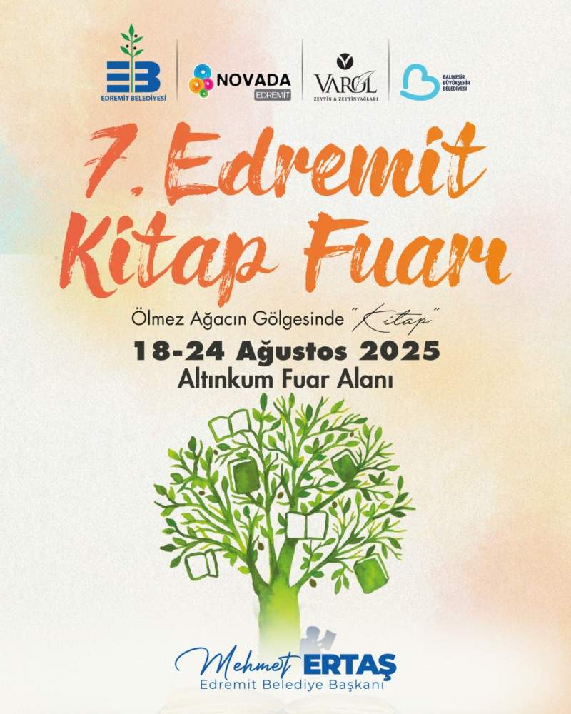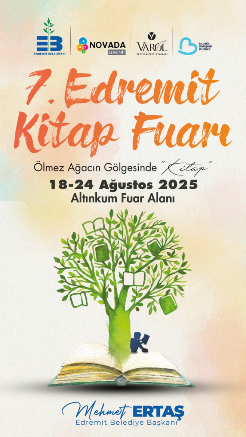 Edremit'in kültürel yaşamına değer katan önemli etkinliklerden biri olan 7. Edremit Kitap Fuarı, 18-24 Ağustos 2025 tarihleri arasında Altınkum Fuar Alanı'nda kitapseverlerle buluşuyor. Bu yıl "Ölmez Ağacın Gölgesinde Kitap" temasıyla düzenlenen fuar, zeytin dalının bilgeliğiyle büyüyen bu topraklarda düşüncenin, duygunun ve edebiyatın paylaşıldığı özel bir buluşma noktası olmayı hedefliyor.