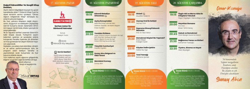 Edremit Belediyesi tarafından bu yıl 7. kez düzenlenen Edremit Kitap Fuarı 18 Ağustos Pazartesi günü kitapseverlere kapılarını açıyor. "Ölmez Ağacın Gölgesinde Kitap" temasıyla gerçekleştirilen fuarın onur konuğu sanatçı Sunay Akın olacak. Bir hafta boyunca sürecek fuarda yazar, şair, gazeteci, akademisyen, yerel yönetici yaklaşık 300 kişi 109 yayınevinde okuyucuları ile buluşacak.