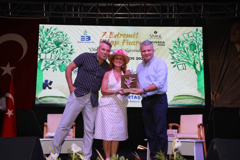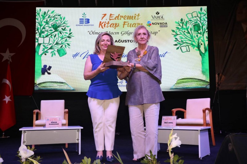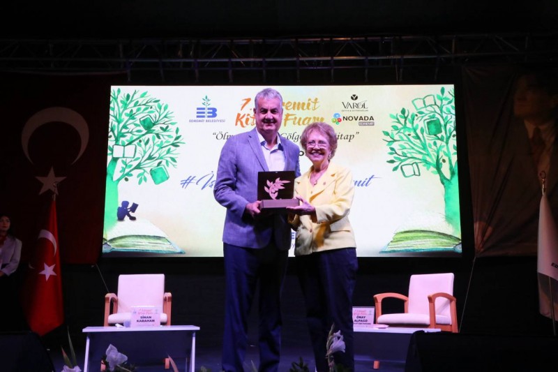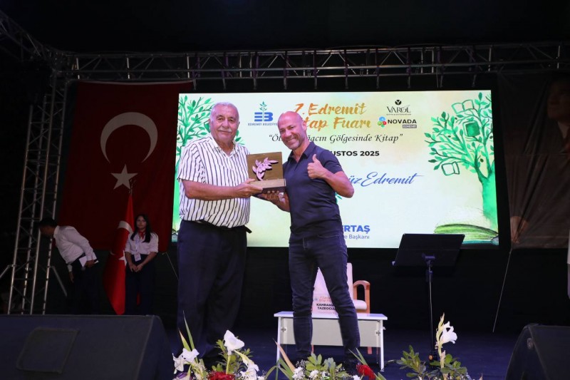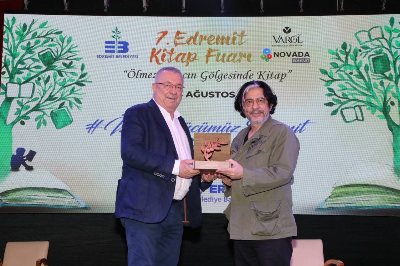 Yoğun ilgiyle takip edilen söyleşide katılımcıların sorularını da yanıtlayan sanatçıya teşekkür plaketini Edremit Belediye Başkanı Mehmet Ertaş sundu.