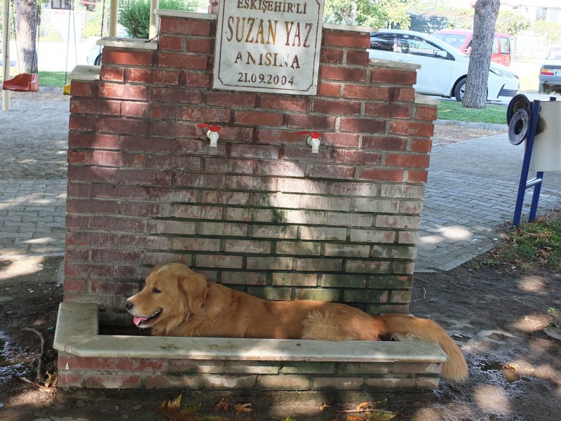 Öğretmenler Mahallesi Suzan Yaz Parkında çeşmede serinlemeye çalışan köpekler ilgi odağı oldu.