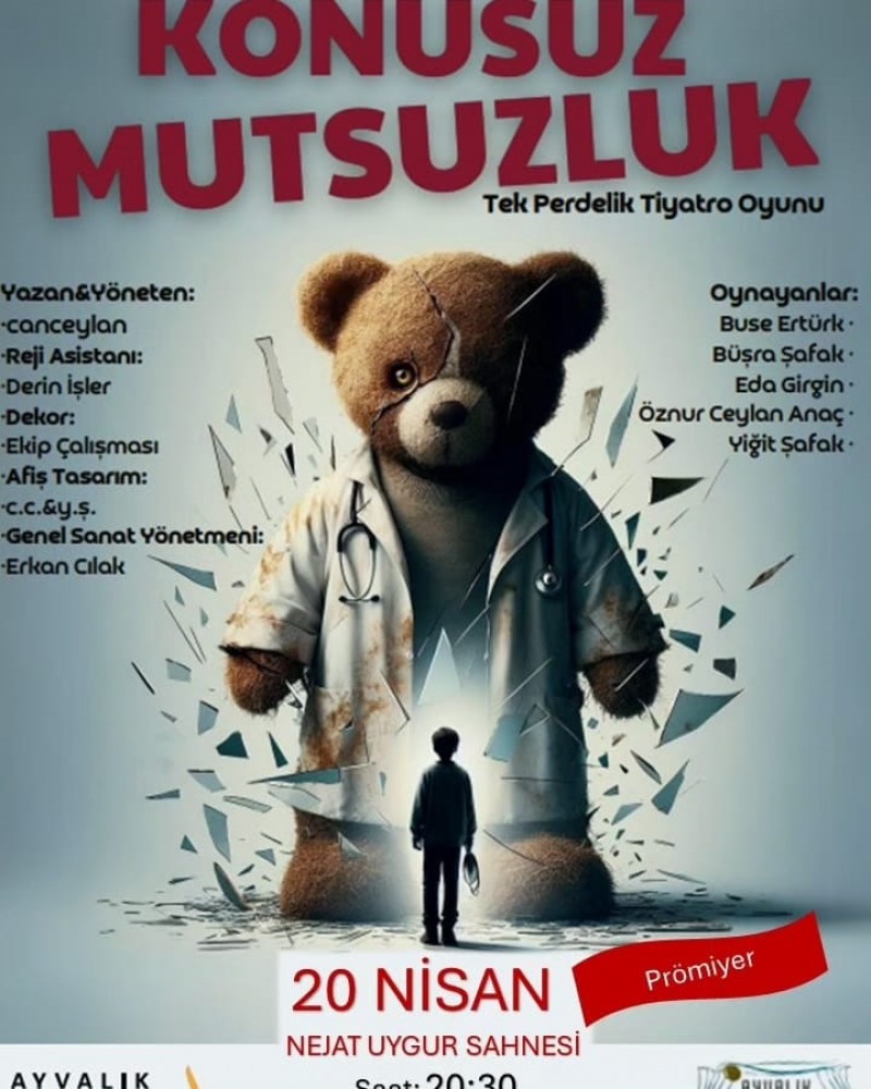 Ayvalık Belediye Tiyatrosu, seyirciyi büyüleyen yeni oyunu "Konusuz Mutsuzluk" ile sahnede büyük bir başarıya imza attı.20 Nisan 2024 günü prömiyeri gerçekleştirilen oyun seyircileri derin bir duygusal yolculuğa çıkardı.