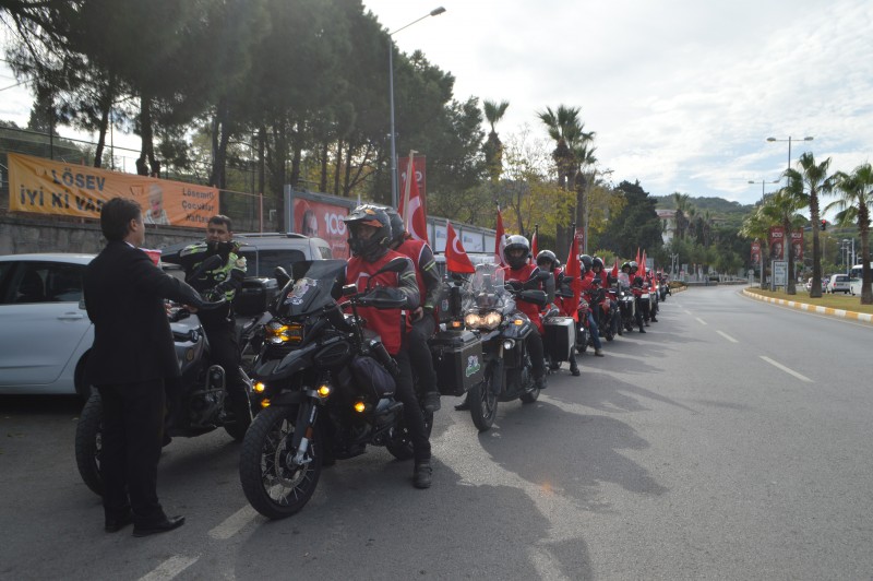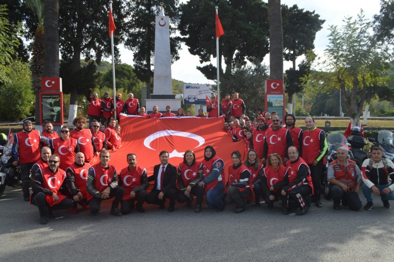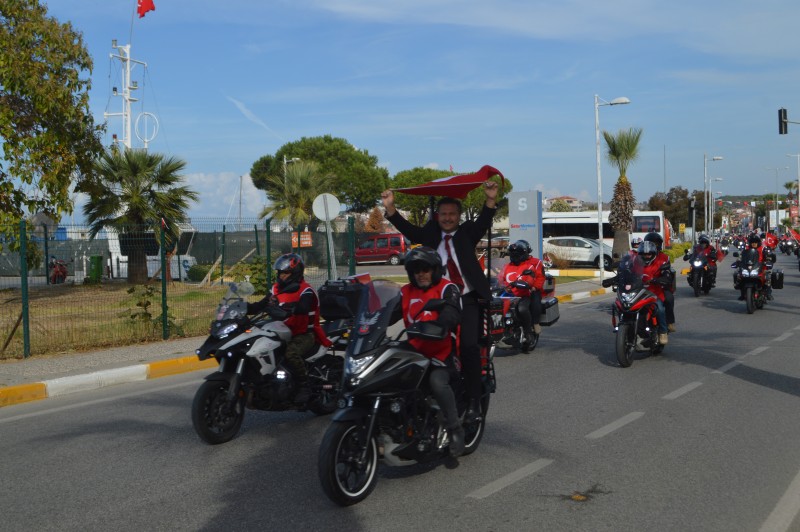 Görkemli şehir turunun ardından Ayvalık Öğretmenevi önündeki İlk Kurşun Anıtı önüne gelen motosikletliler burada saygı duruşu ve İstiklal Marşı’nı birlikte seslendirdi.