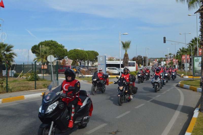 Ayvalık’ta bayraklarla süsledikleri 41 motosikletle şehir turu atan 10 Riders Motosiklet Kullanıcıları Spor Kulübü Derneği’ne Ayvalık İlçe Emniyet Müdürlüğü bünyesindeki motosikletli polislerde eşlik etti.