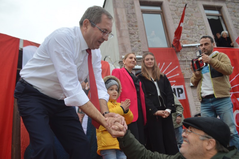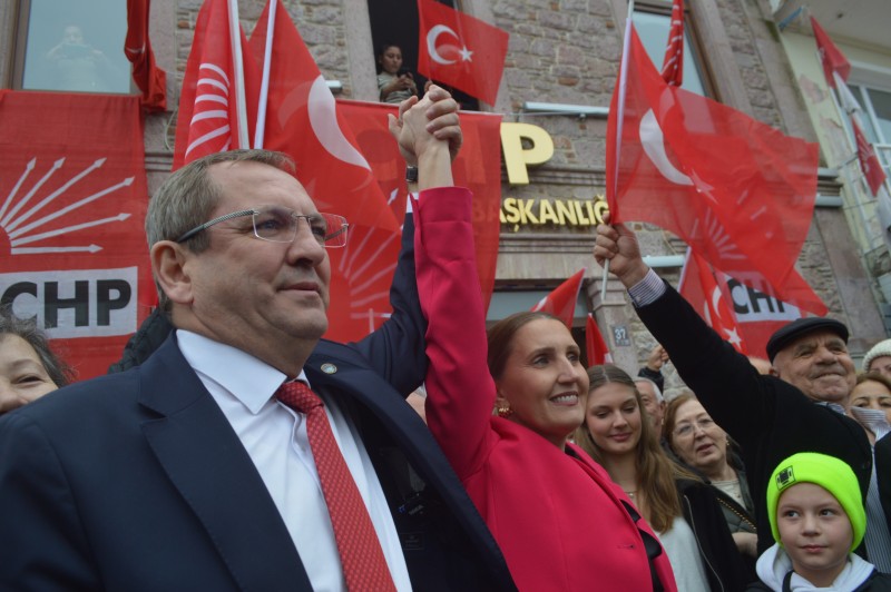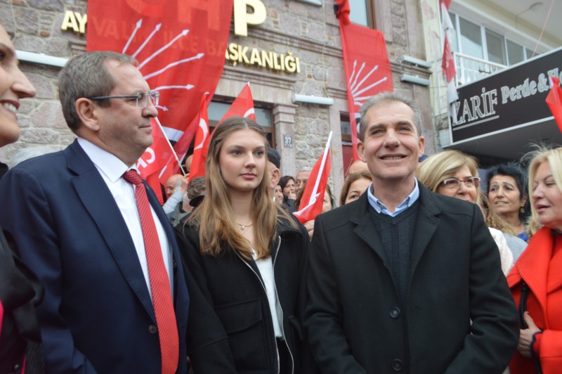 Halkla kucaklaşan CHP Ayvalık Belediye Başkanı ve CHP Belediye Başkan Adayı Mesut Ergin, sevgi dolu tezahüratlar arasında parti binası önünde kurulan kürsüden vatandaşlara seslendi.