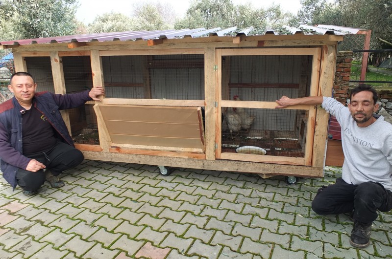 Ayvalık'ın Bağyüzü köyünde 20 yıldan beri bakkallık yapan 3 çocuk babası Mustafa Zeybek, çocuklarını okutmak için Burhaniye'ye taşınırken, Hacıahmet Mahallesi'ndeki evinin bahçesinde tavuk kümesi yapmaya başladı. Kümeslerin altına tekerlek takan Zeybek, çevresindeki dostları için üretime başladı. Ağaç işlerine merakı olduğunu kaydeden Mustafa Zeybek, kümes yapımının kendisi için meslek haline geldiğini söyledi. Gezen kümes yaptıran emlak danışmanı Ali Benderli de kümesi bahçenin neresi müsait olursa oraya taşıdığını söyledi.