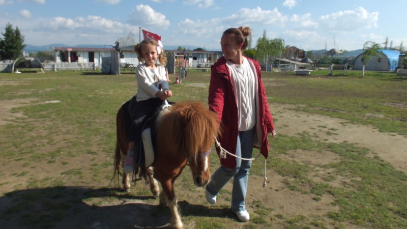 Burhaniye ilçesinde, velileriyle birlikte Ören Meço Tatil Sitesi yanında bulunan Mila Garden işletmesine gelen çocuklar, at binerken mutluluk yaşadı. Midilli Pony atlarına binen çocuklar at binmeyi herkese tavsiye ettiklerini söyledi.