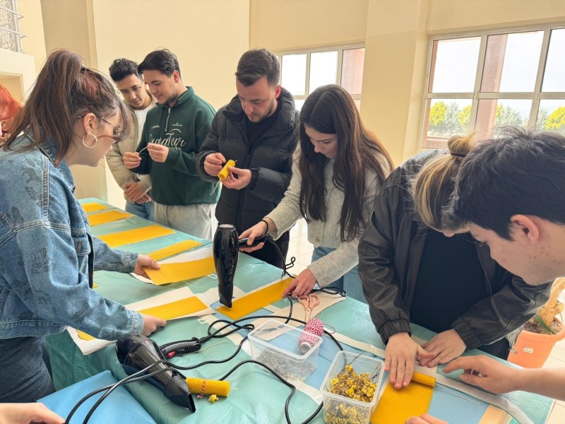 Balıkesir'in Burhaniye ilçesinde Uygulamalı Bilimler Fakültesi’nde Eko Yaşam Kulübü tarafından düzenlenen bal mumu yapımı etkinliği öğrencilerin yoğun katılımıyla gerçekleştirildi. Doğal ve sürdürülebilir üretim anlayışına dikkat çekmek amacıyla gerçekleştirilen etkinlikte katılımcılar, bal mumunun özellikleri ve kullanım alanları hakkında bilgi edinme fırsatı buldu.