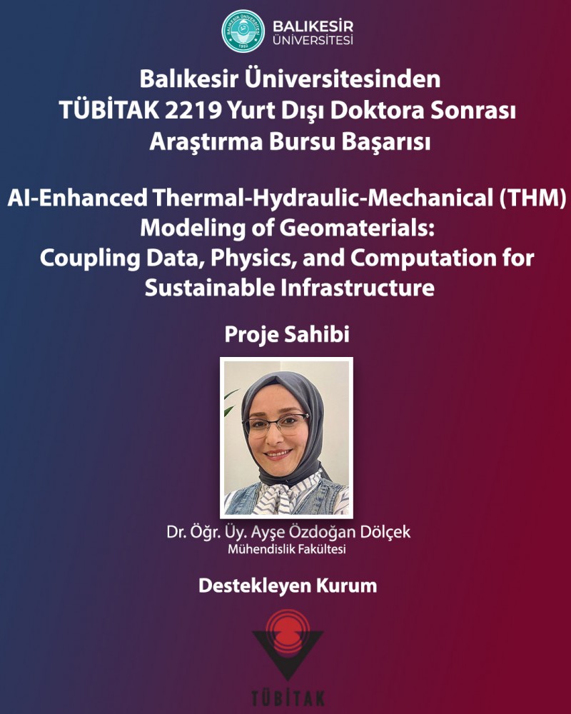 Balıkesir Üniversitesi (BAÜN) Mühendislik Fakültesi Jeoloji Mühendisliği Bölümü akademisyenlerinden Dr. Öğr. Üy. Ayşe Özdoğan Dölçek, “AI-Enhanced Thermal-Hydraulic-Mechanical (THM) Modeling of Geomaterials: Coupling Data, Physics, and Computation for Sustainable Infrastructure” başlıklı projesiyle TÜBİTAK 2219 Yurt Dışı Doktora Sonrası Araştırma Bursu almaya hak kazandı. Bu kapsamda Dr. Öğr. Üy. Ayşe Özdoğan Dölçek, Amerika Birleşik Devletleri’nde yer alan University of Maryland, A. James Clark School of Engineering bünyesinde, Civil and Environmental Engineering Department çatısı altındaki Geosystem Resilience and Infrastructure Transformation (GRIT) Lab'da “Visiting Scholar” olarak görev yapacak.