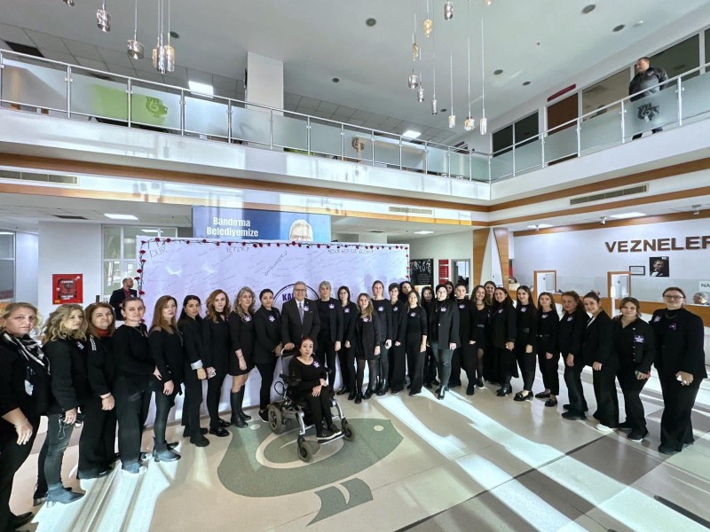 Bandırma Belediye Başkanı Dursun Mirza, 25 Kasım Kadına Yönelik Şiddete Karşı Uluslararası Dayanışma ve Mücadele Günü kapsamında belediye çalışanlarıyla birlikte güçlü bir farkındalık etkinliği gerçekleştirdi. Belediye Başkan Yardımcıları Niyazi Yeloğlu, Cemal Adıgüzel, İsmail Ay, Meclis Üyesi Sami Türkmen ve personelle bir araya gelen Mirza, tüm ekiple birlikte kadına yönelik şiddete dikkat çekmek amacıyla sembolik yakalıklar taktı.