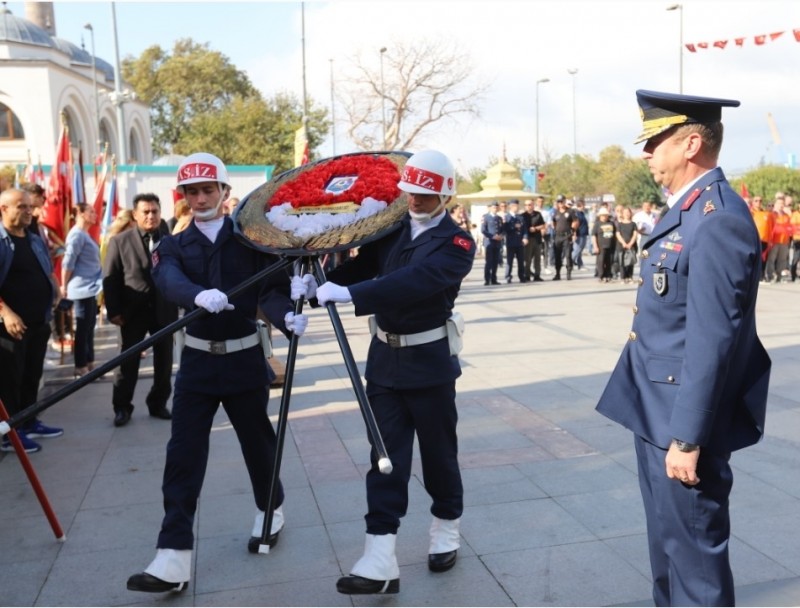 Bandırma'nın düşman işgalinden kurtuluşunun 101.yılı nedeniyle Cumhuriyet Meydanı'nda gerçekleştirilen törende Atatürk heykeline çelenk sunulmasının ardından saygı duruşu ve istiklal Marşı okundu.