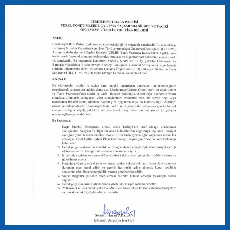 Edremit Belediye Başkanı Selman Hasan Arslan, CHP’nin yerel yönetimlerde çalışma yaşamında şiddet ve tacizi önlemeye yönelik politika belgesini imzaladı. Kadına yönelik şiddet ve tacize karşı önlem alınmasını ve uygulanacak yaptırımlar taahhüt altına alınıyor.